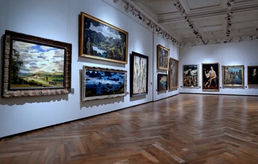 Video Promptu: Farklı tarzlarda birçok güzel sanat eserinin bulunduğu bir sanat galerisinin turu.