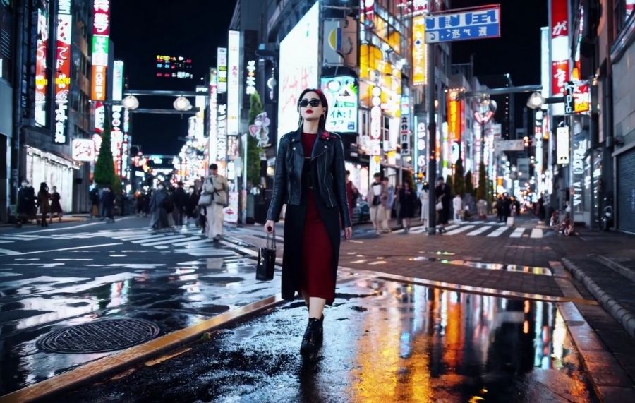 Video Promptu: Şık bir kadın, sıcak ışıklarla dolu bir Tokyo caddesinde yürüyor. Siyah deri bir ceket, uzun kırmızı bir elbise ve siyah botlar giyiyor; siyah bir çanta taşıyor. Güneş gözlükleri takmış ve kırmızı ruj sürmüş. Kendinden emin ve rahat bir şekilde yürüyor. Cadde ıslak ve yansıtıcı, renkli ışıkların aynı zamanda bir ayna etkisi yaratmasına neden oluyor. Birçok yayalar etrafta yürüyor.