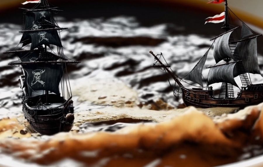 Video Promptu: İki korsan gemisinin birbirine çarpıştığı, bir fincan kahve içinde yelken açarken olan gerçekçi yakın plan bir video.