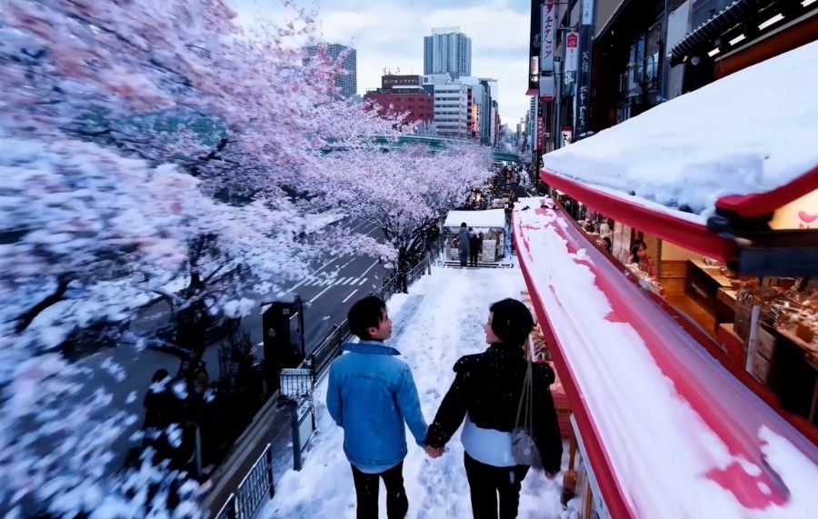 Video Promptu: Güzel, karlı Tokyo şehri hareketli. Kamera, kalabalık şehir caddesinde hareket ediyor, güzel karlı havanın tadını çıkaran birkaç kişiyi ve yakındaki tezgahlarda alışveriş yapan insanları takip ediyor. Rüzgarla uçuşan muhteşem sakura yaprakları, kar taneleriyle birlikte dans ediyor.